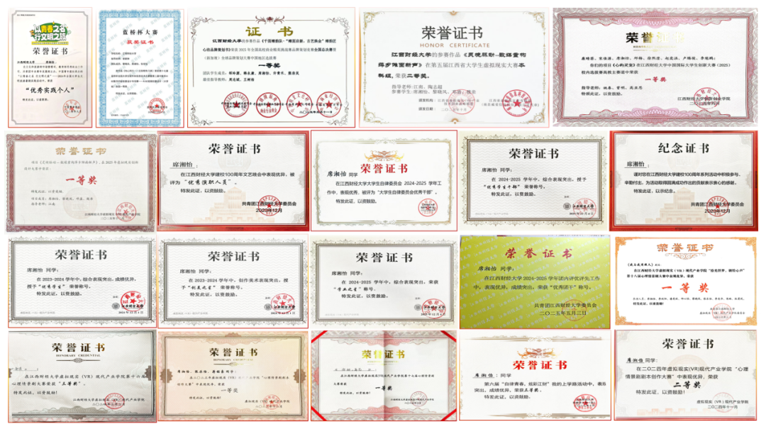 在学业道路上,她始终脚踏实地,笃行不怠。专业成绩位列专业前3%,多门课程取得90分以上佳绩。凭借扎实的学识与全面发展的综合素养,她荣获国家奖学金、校一等奖学金,并获评“学业之星”、“创美之星”及优秀学生干部、优秀学生、优秀团干等多项荣誉,以勤奋书写着青春答卷。此外,作为科创先锋,她敢于挑战高峰,累计斩获国家级、省级、校院级奖项20余项,其中包括两项国家级学科竞赛一等奖。授权专利1项、软著2项。作为灵境社骨干,她长期在工作室推进项目研发,开展技能培训,坚持“以赛促学、以工代练”,用一个个落地作品践行知行合一的创新梦想。