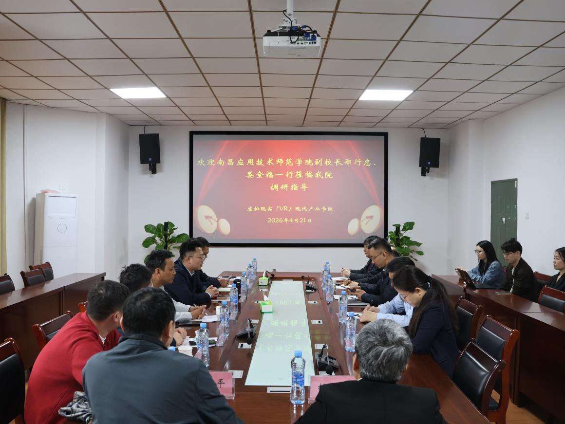 2026年4月21日上午,南昌应用技术师范学院副校长郑行忠、娄全福一行8人莅临电子竞技博彩 考察交流。学院院长万征、党委书记彭敏,副院长李华旸、吴洁,数字媒体艺术专业负责人及教师参与接待并座谈。双方围绕产业学院建设、产教融合落地等核心议题展开深入探讨。